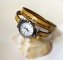 Relógio europeu de pulso duplo de couro para mulheres, com um mostrador em prata e uma pérola redonda a condizer como decoração.